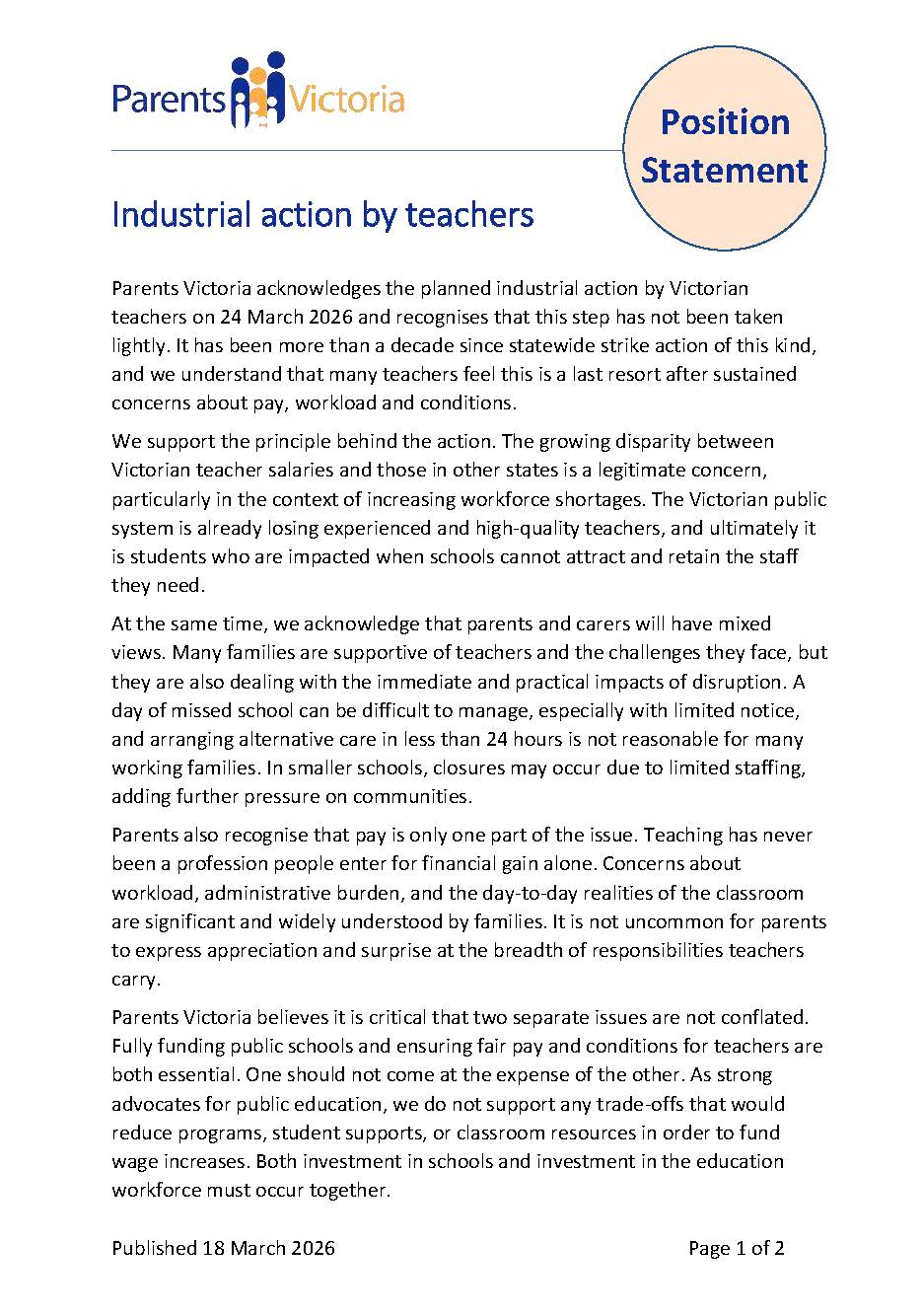 As you will probably already be aware, the Australian Education Union (AEU) has scheduled industrial action in the form of a teacher strike on Tuesday 24 March.
