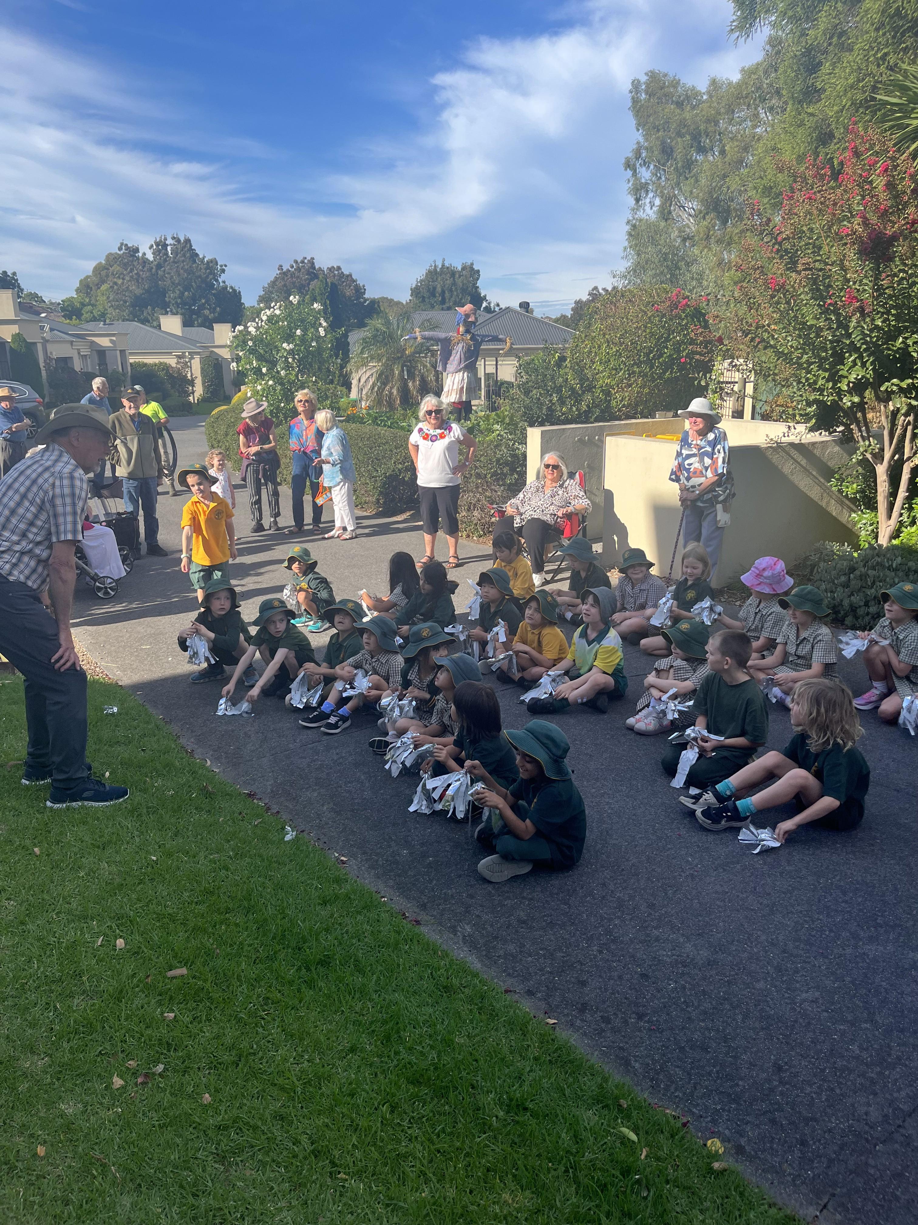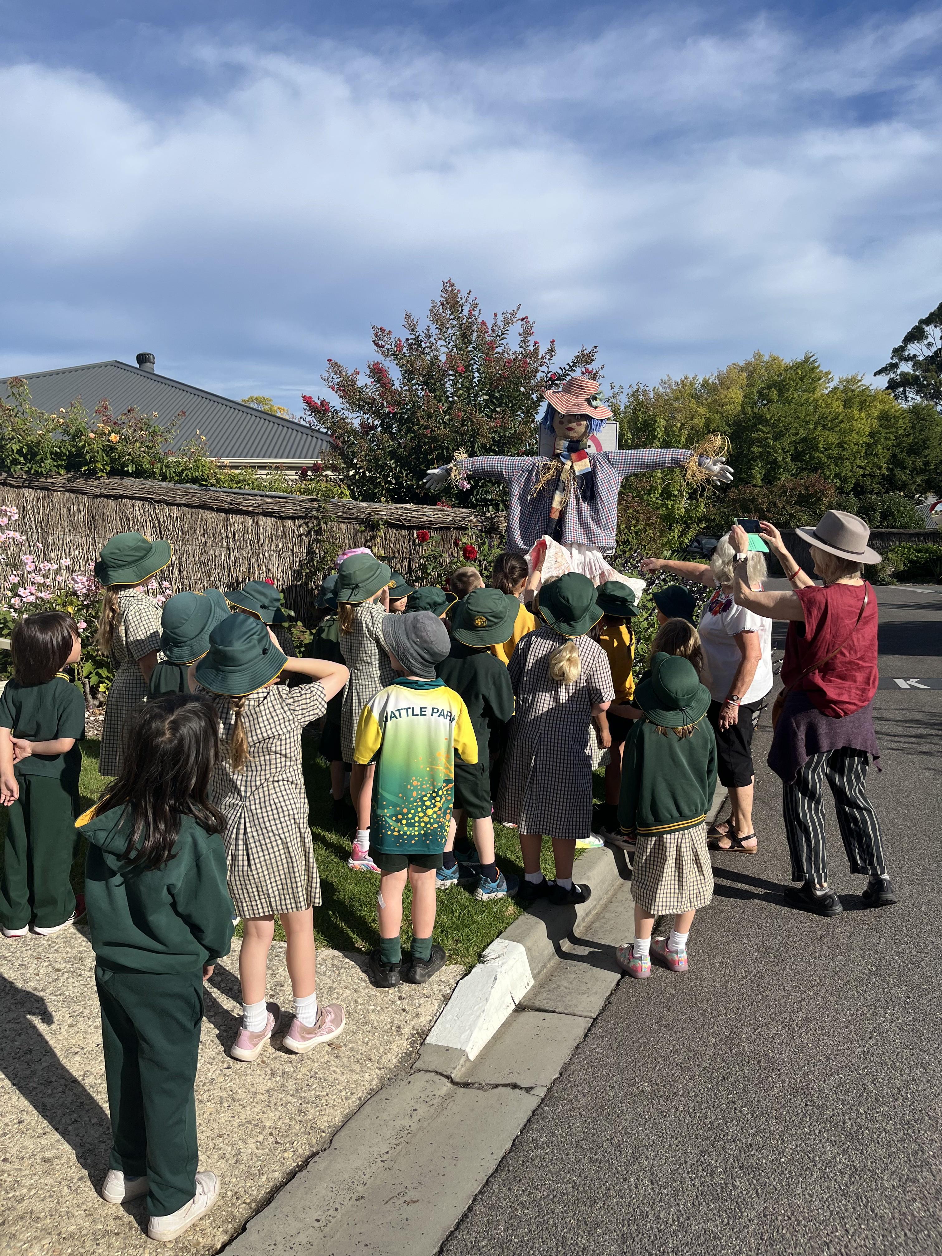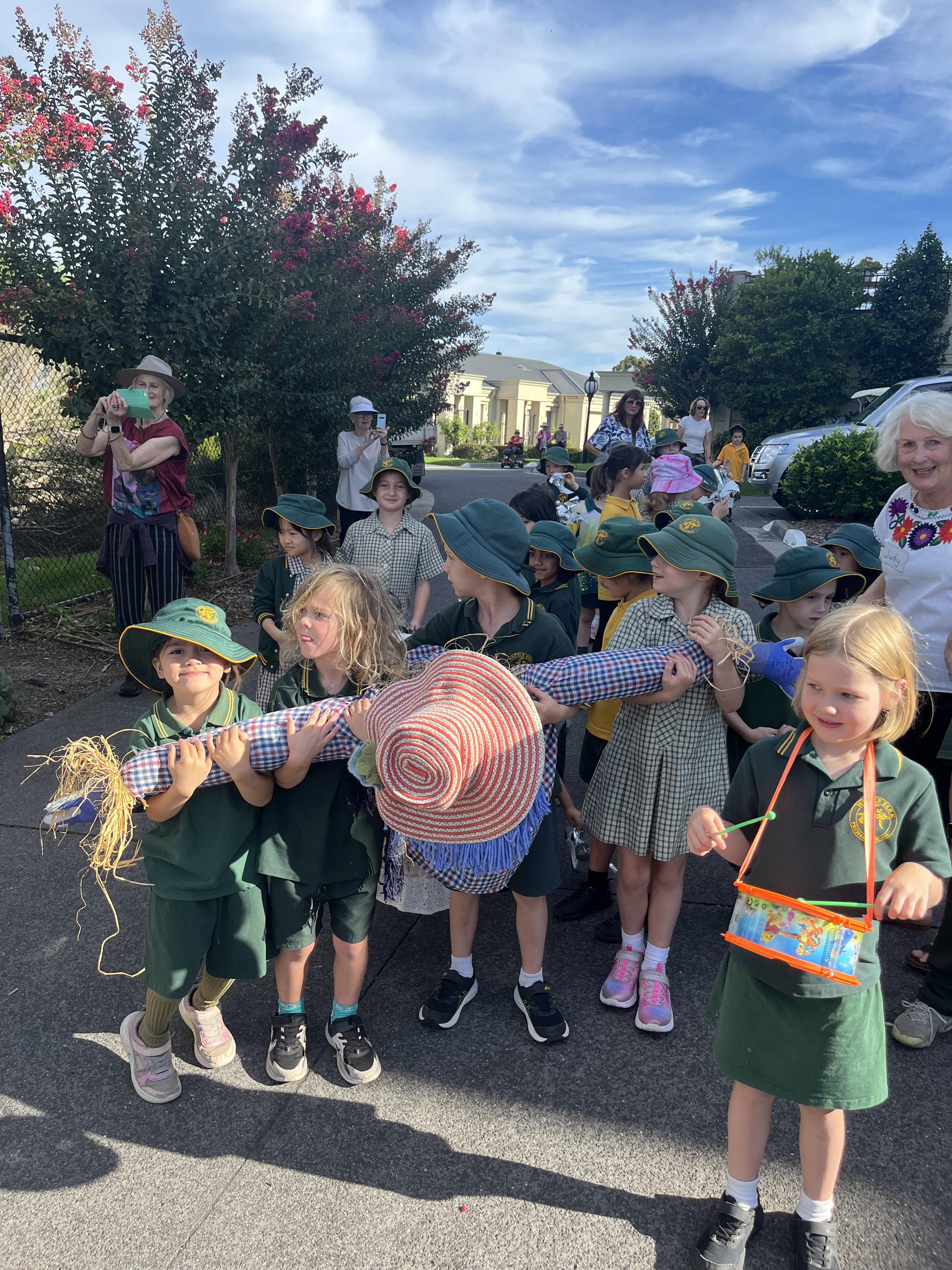 Our Year 1 students had a wonderful time visiting Cameron Close for the installation of our new scarecrow. The children walked over with excitement and were thrilled to see the scarecrow in its new home. There was lots of singing, dancing and joyful celebration as everyone enjoyed the special moment together.
